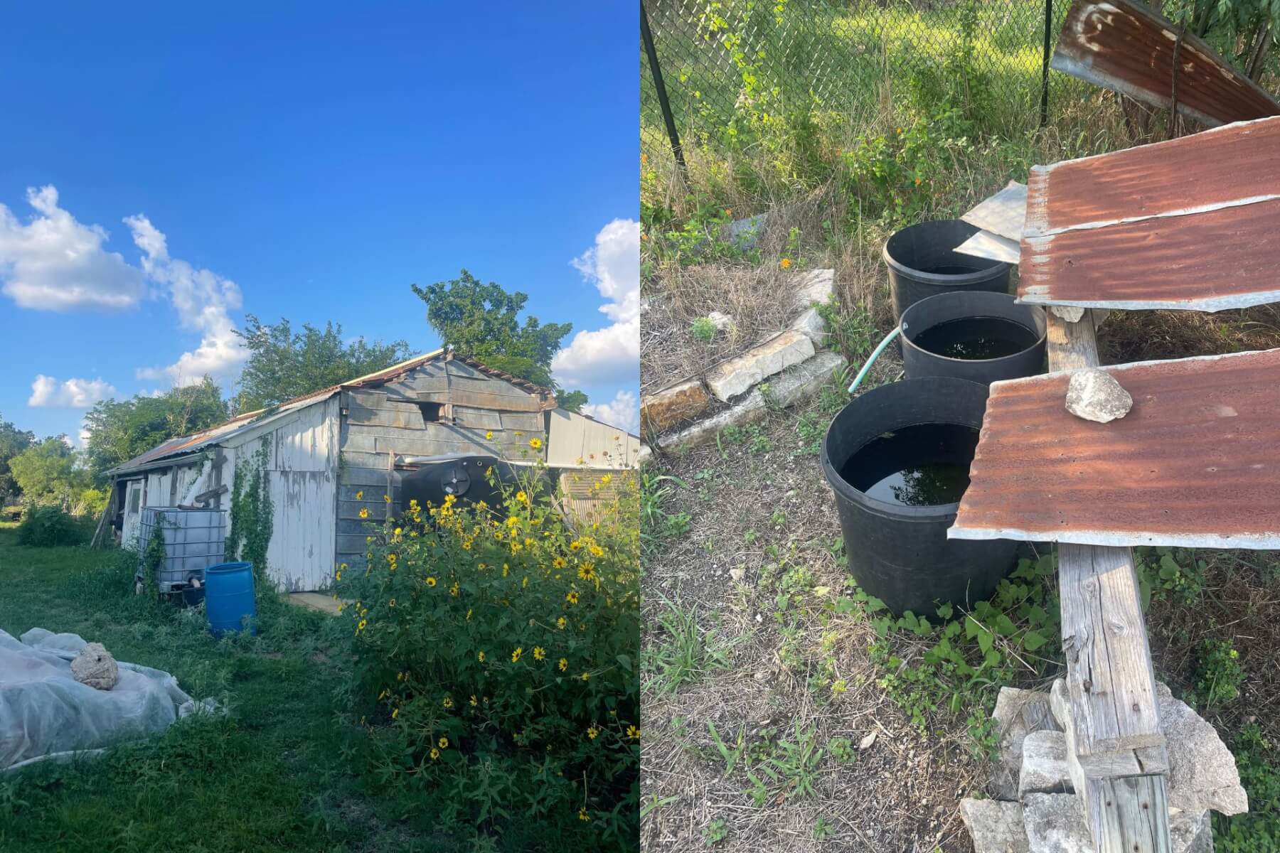 Getting resourceful: Miller build a shed out of salvaged materials (left) and captures rainwater through his DIY system (right). Photos by Piper Guinn