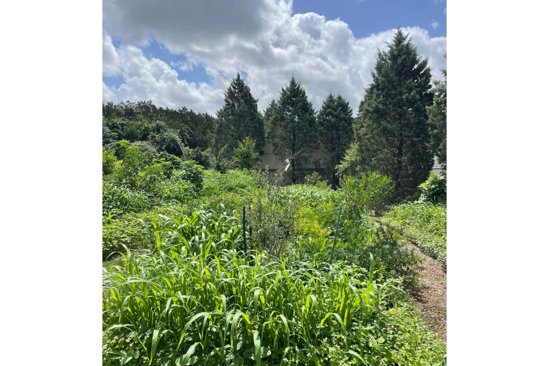 A single row of native grasses in the St. Edward’s Food Forest will help support an ecosystem that retains water and and improves biodiversity. Photo by Piper Guinn