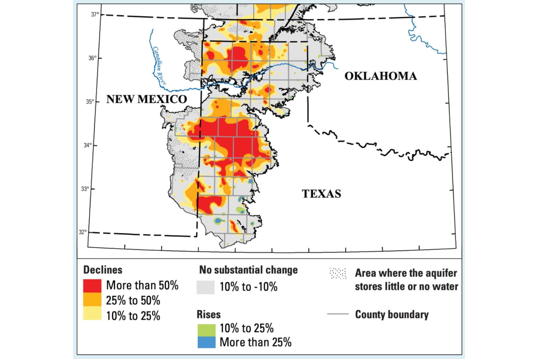 Percent depletion of ground water in the High Plains Aquifer, 1950–2013. Approximately 14 percent of the farmland in Texas is irrigated; in the Panhandle and the plains to the south, most irrigation water is ground water from the High Plain. Courtesy of United States Geological Survey