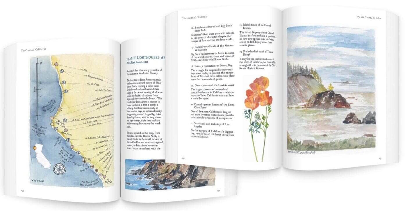 Kaufmann laughingly calls his attempts to cover the scope of California’s ecosystems—the series currently includes The Forests of California (2020) and The State of Water: Understanding California’s Most Precious Resource (2019)—“fantastic failures,” and says he is “totally fine with that.” But this presumes a reader comes to them with certain expectations in the first place. I think it is safe to say that when one pores over the nearly 650-page Coasts of California—filled with vivid watercolor illustrations of flora and fauna and exquisite vistas and scenes, in addition to hand-colored maps of everything from coastal wildflower blooms to amphibian habitats to oceanic chlorophyll concentrations combined with painstakingly researched facts and histories—Kaufmann’s knowledge of and respect for these myriad forms of life cannot help but spark one’s own spirit of inquiry and adventure.
