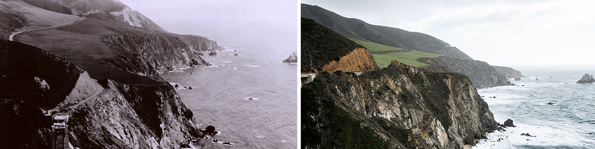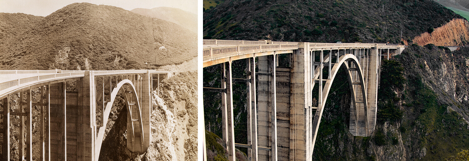 Although it bears a similar appearance to when the nearby bridge was constructed in 1932, there are noticeable changes in the hillside: habitual reconstructive efforts have carved the winding road much deeper into the hillside than before.