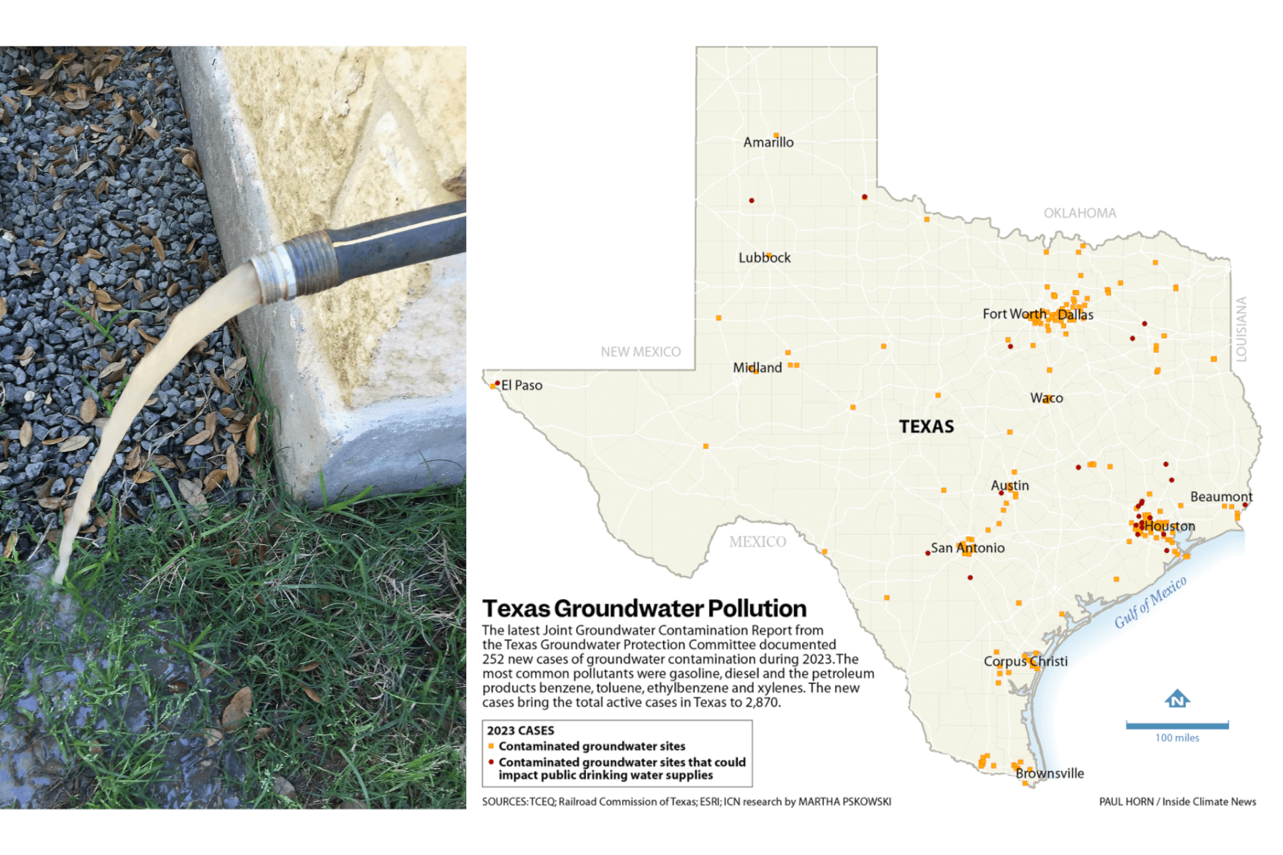 A Blanco resident pulls a water sample from their contaminated well to compare it to bottled water near Austin. Courtesy of Brett Coomer/Houston Chronicle via Getty Images