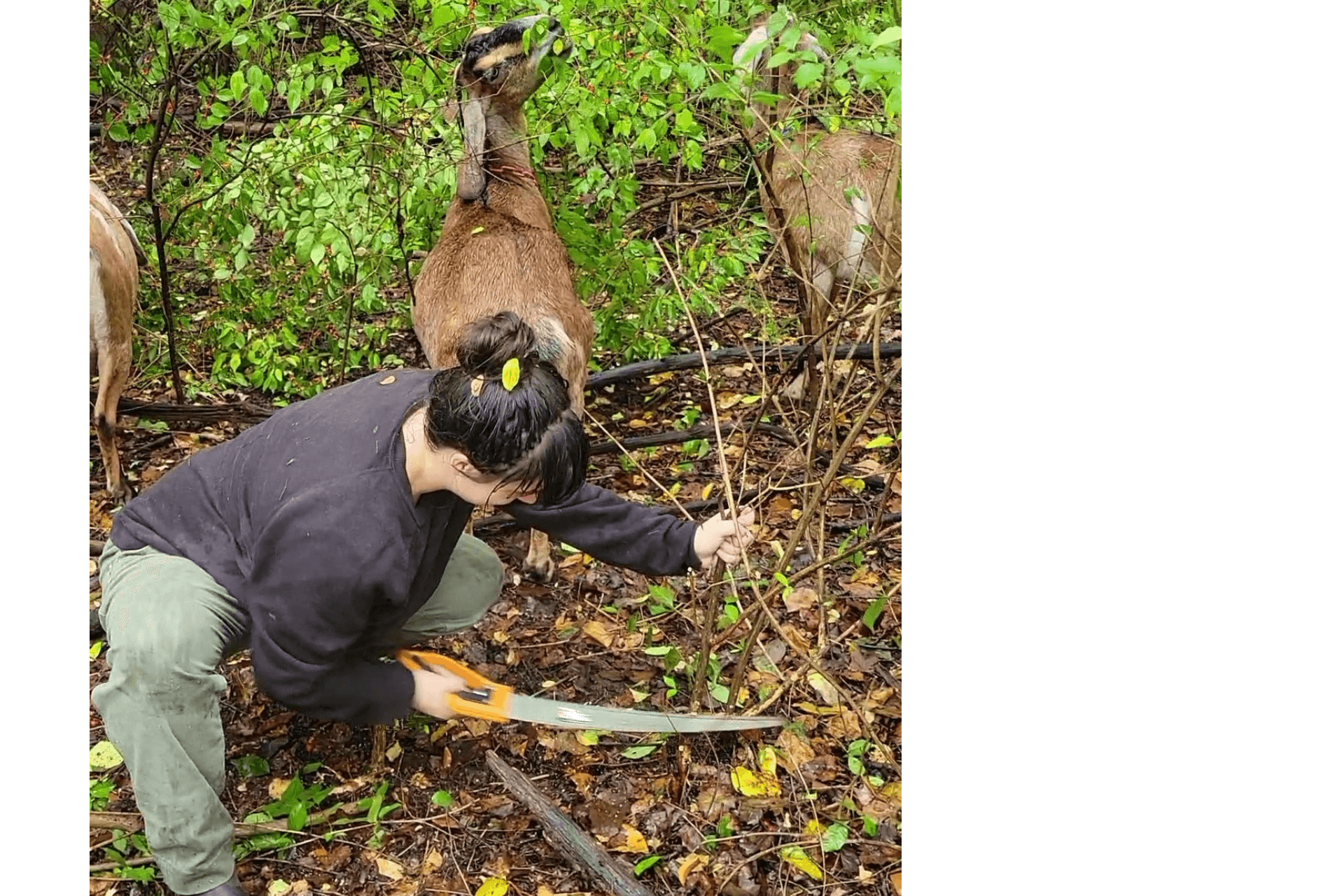 Although the goats are quite insatiable browsers — meaning they enjoy the woody parts of plants, as opposed to grazers, who prefer grass — and impeccable climbers (a point of jealousy in our club, to be sure), they still need help accessing the tallest plants. In many cases, what makes invasive plants such successful colonizers is their ability to vine, which effectively blocks life-sustaining sunlight for low-height native plants.