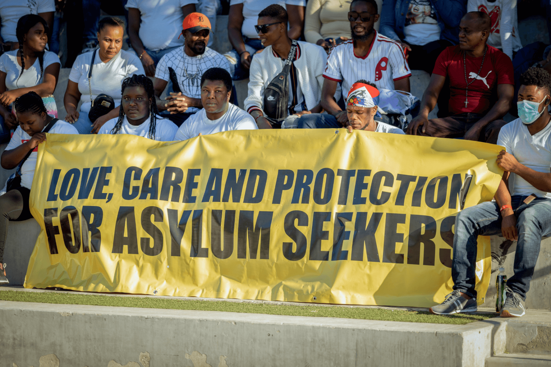 Late in the afternoon, a couple of men with official-looking vests were seen setting up a canopy on the stage bearing the advocacy group Haitian Bridge Alliance (HBA) logo as women checked the mic. This was a well-oiled machine. The migrants in the bleachers held yellow roses and a big yellow banner with black letters spelling out, “Love, Care and Protection for Asylum Seekers.”
