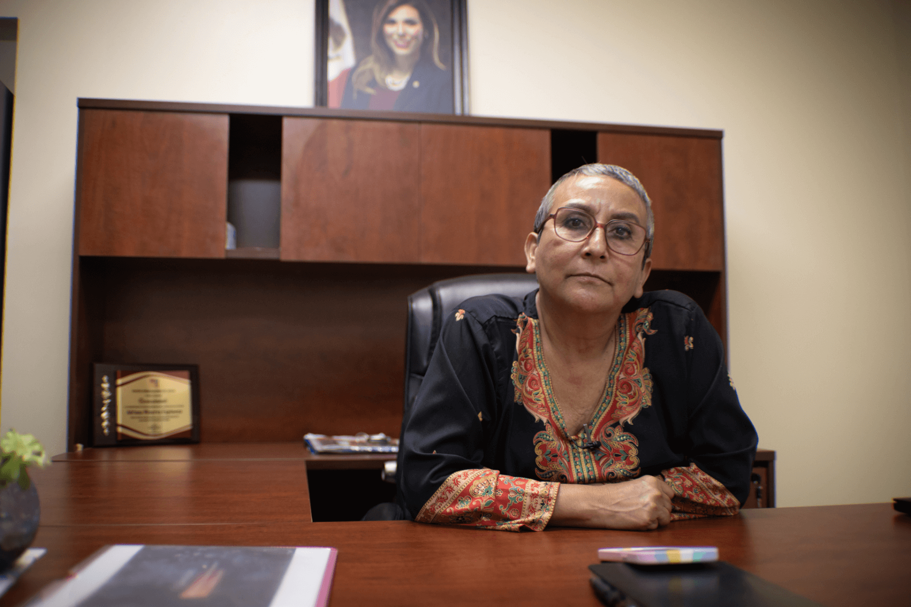 During a recent visit to her office, Adriana Espinoza, Baja’s Undersecretary for Migrant Affairs, sits behind a large wooden desk in an office in a government building. Secretaria General De Gobieno, Gobieno do Baja California is spelled out on an oversized awning that wraps the top of the building near the Otay Mesa port of entry at the U.S.-Mexico border.