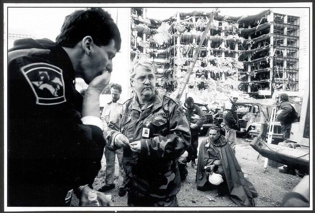 In this photo, U.S. Army Chaplain Lt. Col. Roberson gives communion to search and rescue workers across the street from the Alfred P. Murrah Federal Building in Oklahoma City. The building was devastated by a truck bomb on April 19, 1995 that killed 168 people and injured hundreds of others. Photo from the U.S Department of Defense
