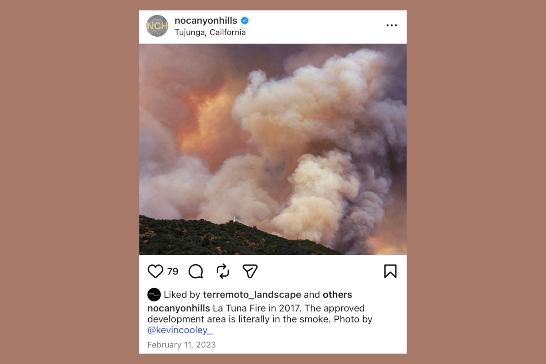 The next post was an archival poster from the Sierra Club, proclaiming its opposition to Canyon Hills in 2004. A few days after that, a photograph showed the mountains engulfed in thick, billowing gray smoke and raging flames, the Santa Ynez cross tiny against its magnitude: the 2017 La Tuna Fire. “The approved development area is literally in the smoke,” the caption read.