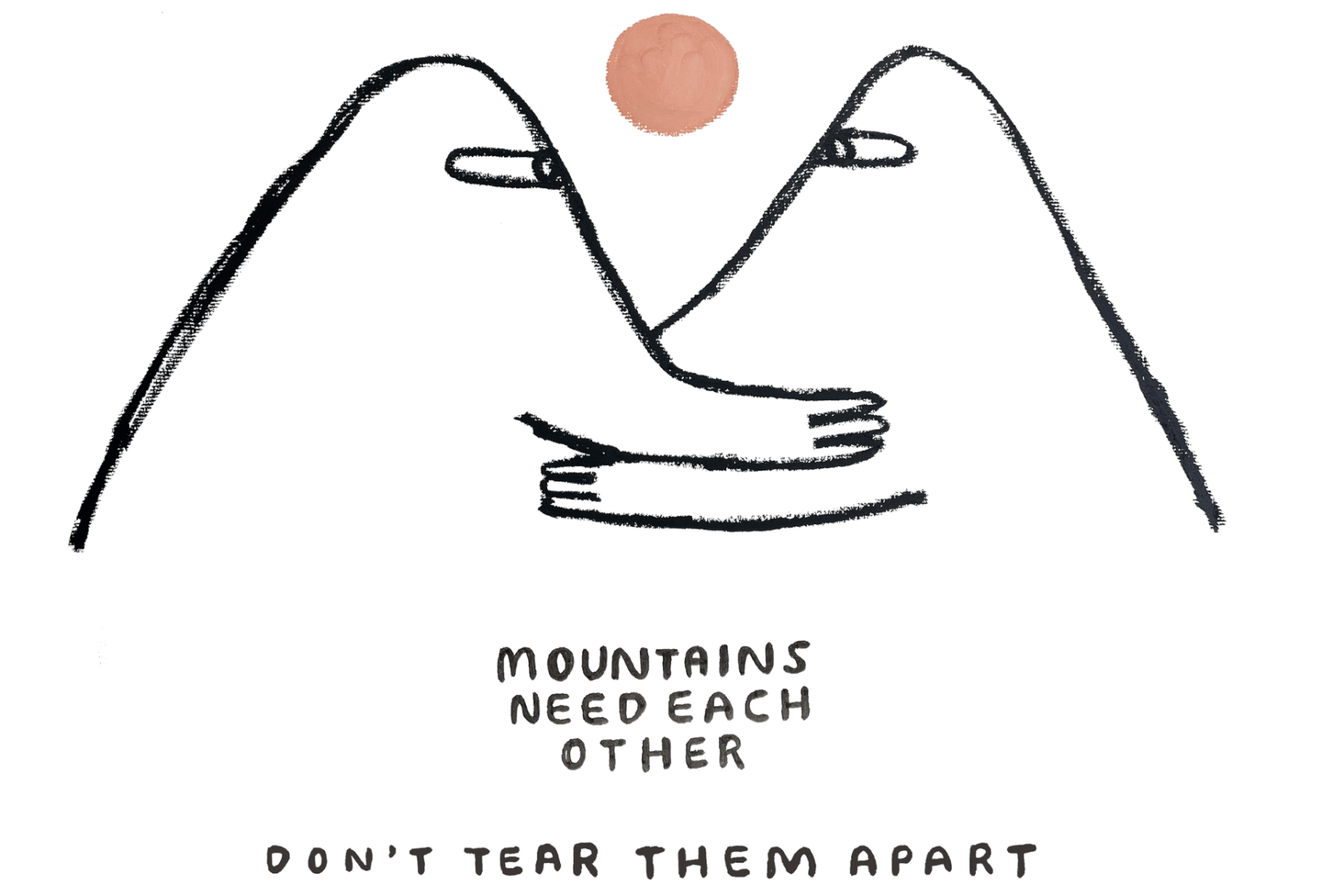 It was through an artist friend who lives in Tujunga that I learned about No Canyon Hills in the first place. A member of the board who sometimes hosts group meetings at her kitchen table, Christian Kasperkovitz creates work under the name Elkpen that is deeply connected to California’s ecology. In support of the effort, she painted a colorful portrait of Diva and made a series of simple line drawings, like one that shows two mountains embracing, eye to eye. “Mountains need each other,” reads the text. “Don’t tear them apart.”