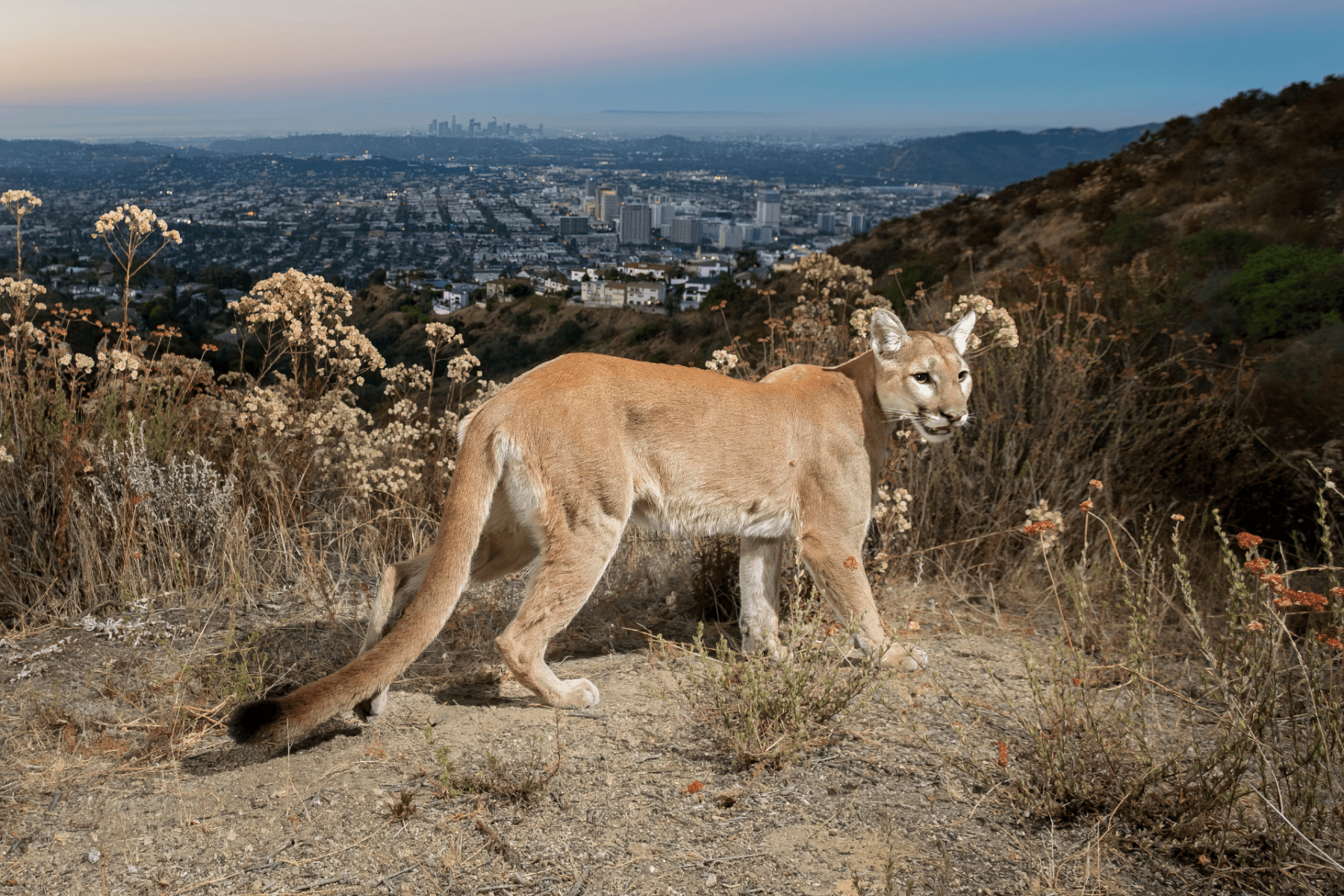 Over the next two years, No Canyon Hills regularly shared photographs and infrared videos of Diva and the La Tuna Puma prowling through tall grasses and lapping at pools of water. One instantly iconic shot by Turner shows Diva posing regally on a ridge over Glendale, the downtown skyline rising in the background.