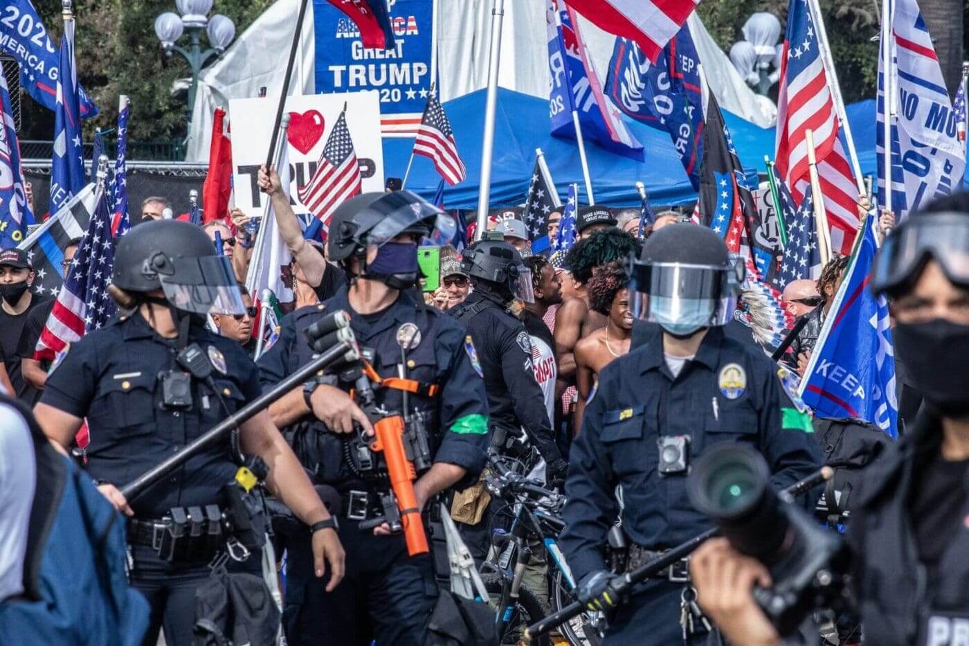 Police presence at the USA Freedom Rally in Beverly Hills on October 31st, 2020. The rally was later declared an unlawful assembly by police forces after an altercation between a Freedom Rally protestor and a counter-protestor. Photo by Clara Mack